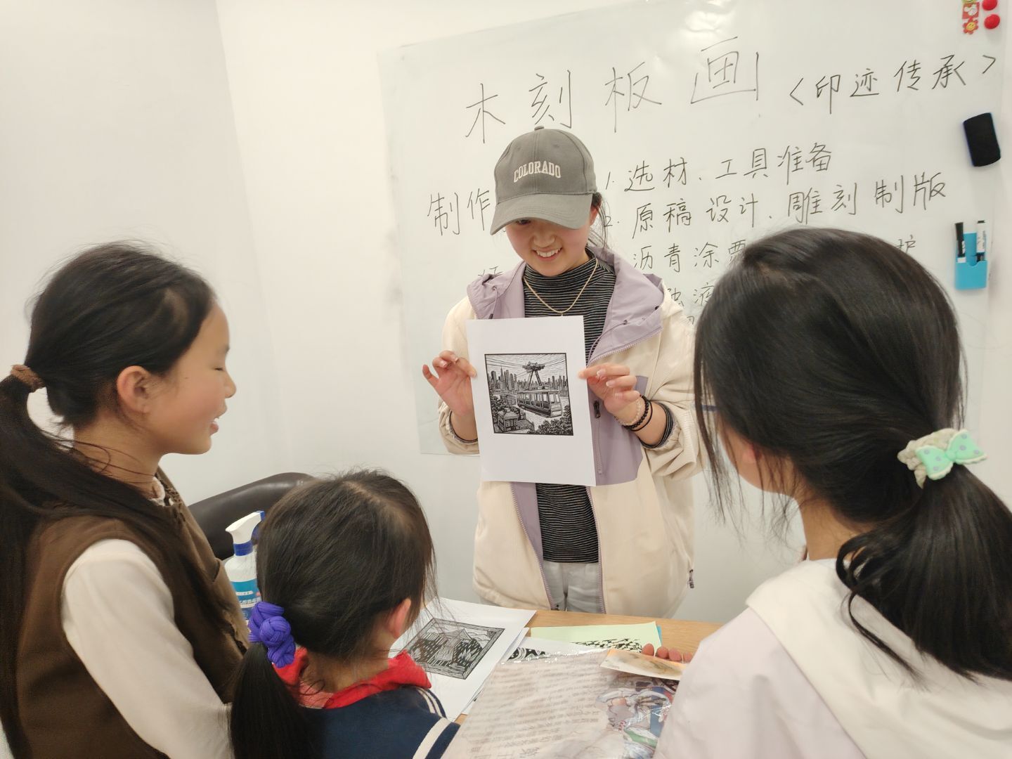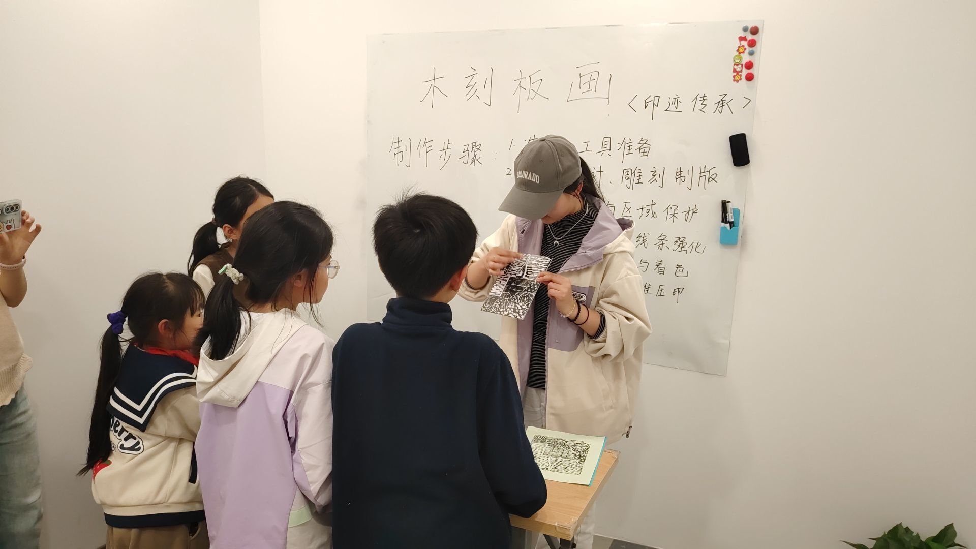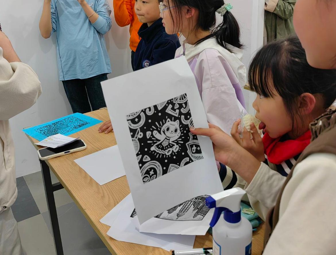 印迹传承工作室的老师以“版画:印痕中的文明密码”为题,带孩子们穿越时空——从唐代雕版印刷到明清年画,从《门神》的祥瑞寓意到现代城市风光主题创作,每一刀刻痕都是与历史的对话。孩子们瞪大眼睛,惊叹于“原来一张木板也能讲故事!”